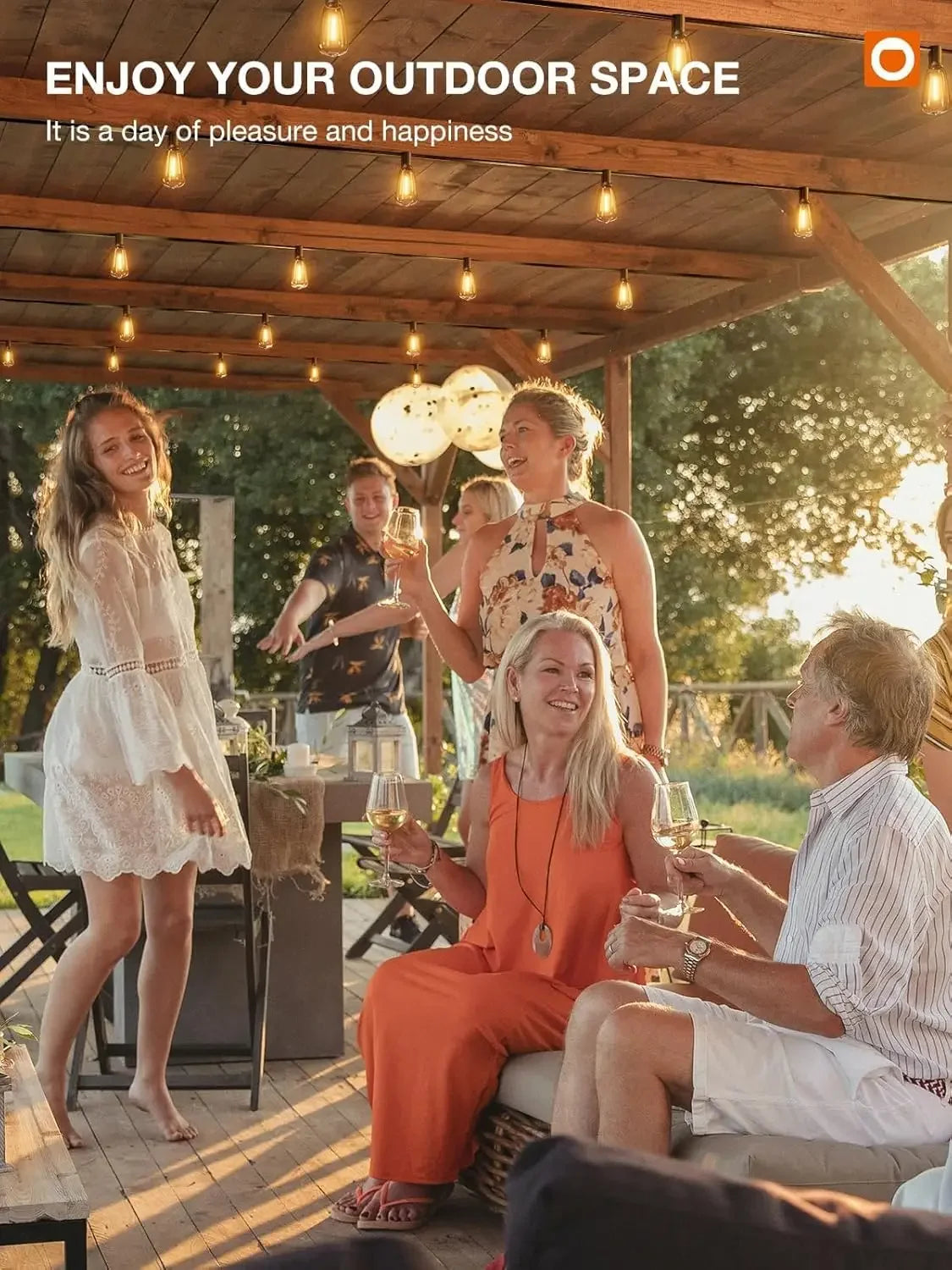 【Light up outdoors, rain or shine】Our ETL-certified, IP65 string lights stand tough against weather. Shatterproof PET bulbs of the patio lights ensure safety – no glass, just durable plastic. Efficient & lasting glow